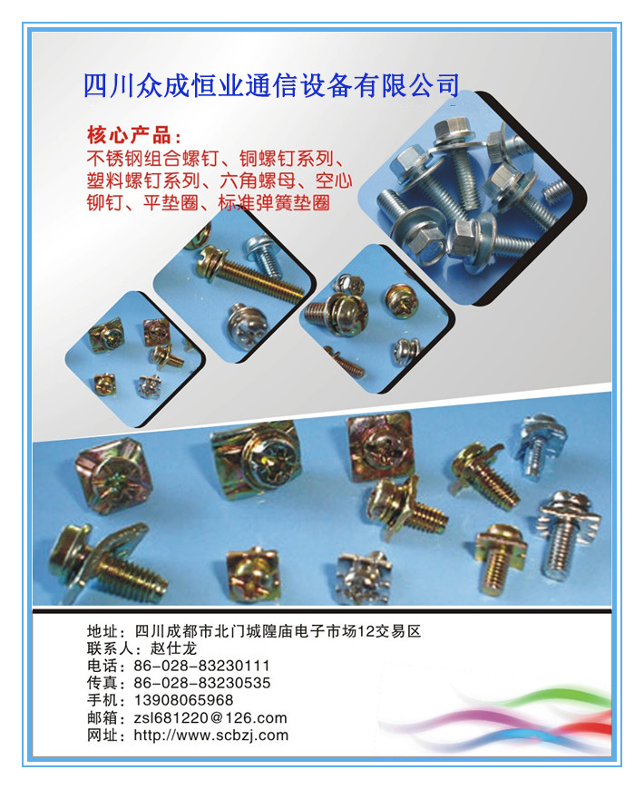 主要經(jīng)營項目:標(biāo)準(zhǔn)件。電子產(chǎn)品、五金交電、主要經(jīng)營:不銹鋼標(biāo)件、銅鍍銀調(diào)試螺釘、碳素鋼標(biāo)件、各種非標(biāo)件、銅柱訂做,電子元器件,專業(yè)代理安費諾QMA,SMA,BNC等系列接頭,通信射頻線,連接器,尼龍扎帶等